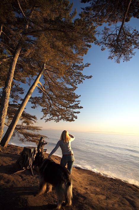 The views are incredible as you continue along the edge of the bluff. There are openings in the fir and eucalyptus trees here and there and an assortment of places to sit on the trunks of downed trees and watch the sunset. If you would like to make this a loop trip, continue east along the bluffs until you reach the end of the property and the start of the residential area. It is a half block to Mesa Lane and the steps that will take you down to the beach.