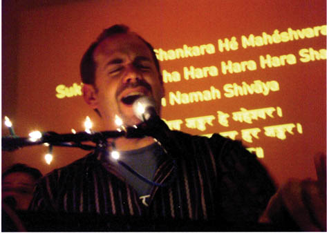 Part of kirtan’s popularity stems from the flexibility of the form. The contrast between Krishna Das and Dave Stringer provides a good illustration of the range of approaches. Krishna Das seemed to be leading a devotional practice for those largely already in the know. He freely told stories about his guru, and did not assure the crowd-as he did in the early days-that just because they were chanting Hare Krishna did not mean they had to wear orange sheets or shave their heads. He did not explain how to chant, and though a sheet was handed out with the words, anyone trying to follow it would have been lost, since many of the chants performed did not appear on it. Indeed, the crowd pretty much knew everything already by heart, bringing the melodies back to the ones they’d heard on the albums whenever the leader broke into anything more musically challenging.