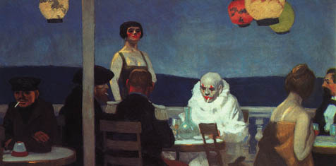 My favorite Hopper painting is “Soir Bleu” (1914), which I always return to and spend much time looking at whenever I visit the Whitney Museum of American Art in New York. This early image, reproduced in Silent Theater, reveals an intimate restaurant balcony with three tables, colorful Chinese lanterns floating above it, and a high, uneven horizon where deep blue sea meets violet air. At the central table sits a bald-headed clown, all in white save the red makeup on his eyes and lips, accompanied by two men in dark clothing; a woman in an olive green dress stands behind them. A couple in smart evening wear sits at the table to the right, while a lone figure occupies the table to the left. The scene is mysterious, uncanny, and strangely mesmerizing-the enduring qualities of Hopper’s work.