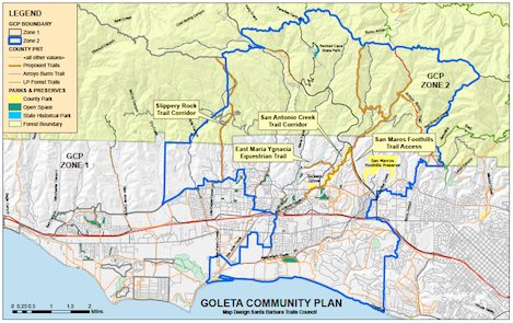 Map outlines boundary of Goleta Valley Community Plan area and several initial proposals for new trail access in the Goleta Valley. The Trails Council is seeking input on additional trail access within the planning area and in other parts of the community.