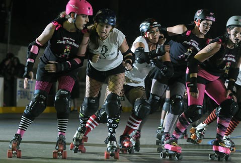 It was not much of a contest on the scoreboard-our Betties won, 184-40-but on the track, both teams got in their share of licks and took their share of spills. The Betties’ jammers-the skater who starts at the back of the pack and scores points by lapping her opponents-were just too quick, too daring, and too elusive. Leading the way was the team captain, Viva Violence!, who adroitly weaved her way through thickets of skaters like Zenyatta.