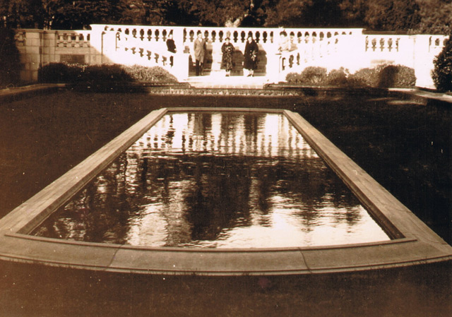 Huguette and Anna E. Clark with other relatives and friends at the reflecting pool on the estate, circa 1935-1940.