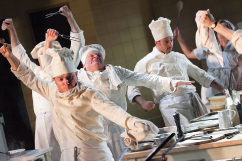 One of the tricks of the play is the actors go through all the actions of cooking, using real tools, utensils, and gas-fueled ovens, but no real food. “It’d be chaos if we had real food,” Roukin admitted, “a health-and-safety nightmare. Plus, if you used real food, the audience would be obsessed with the chef chopping an onion, to see if he’d cut his finger off. It’s mentally stretching, for in order for the audience to believe you have food in front of you, you’ve really got to see it as an actor, because if you don’t, they don’t.”