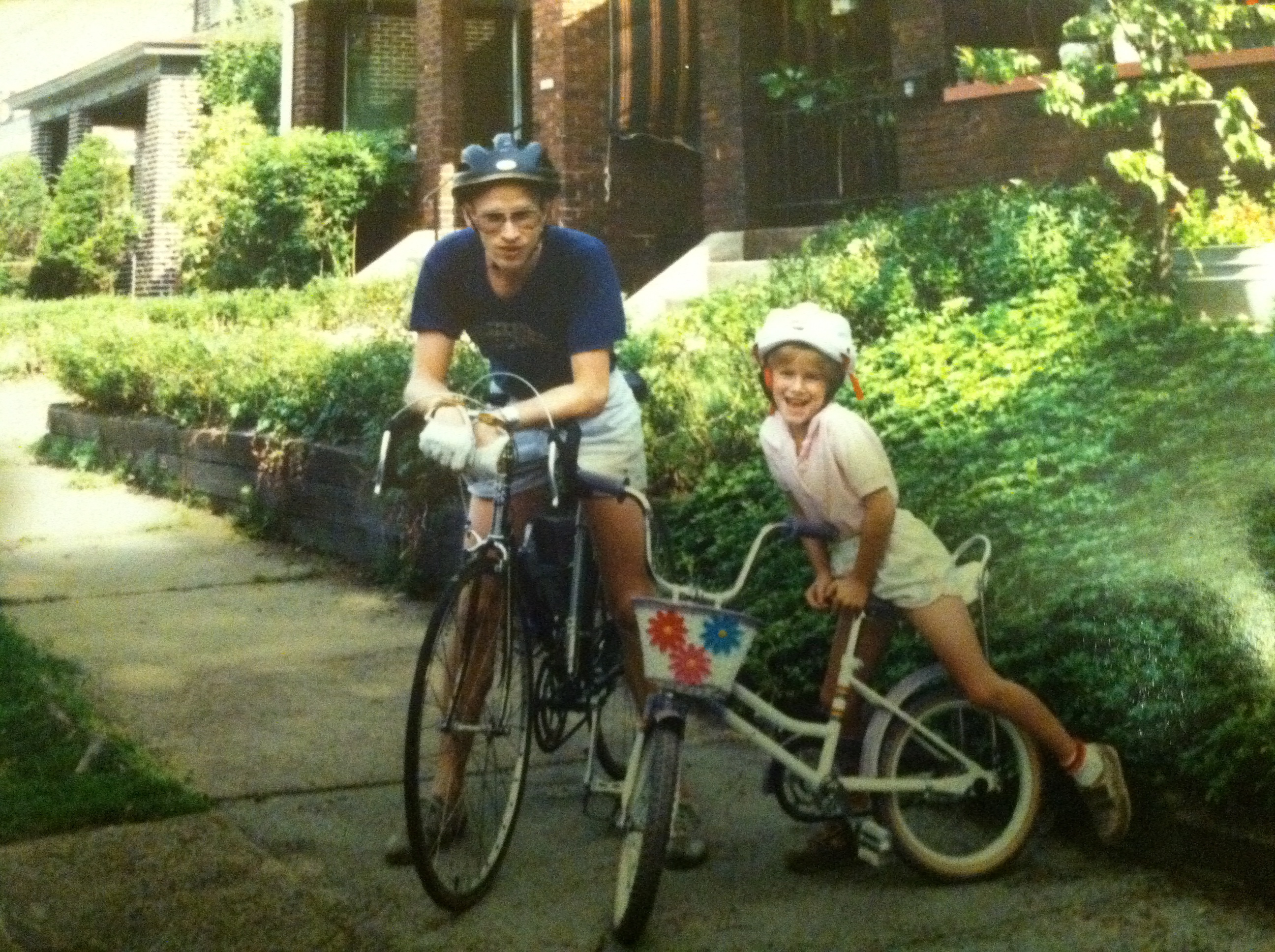 Years later in Pittsburgh, PA, my daughter, Danielle, learned how to ride a bike with my help. There were still no classes, but she did wear a helmet, as did I. Here’s the proof.