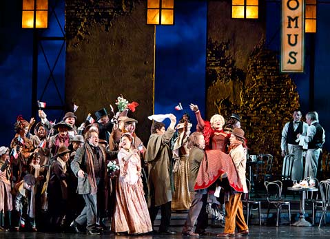 Act Two belongs to the charismatic and mischievous Musetta, played and sung with charm and abandon by Jan Cornelius. She so completely dominates the bustling Café Momus sequence that it would be easy to overlook the splendid work done by the others — Mackenzie in particular, but also the entire chorus, including Ernest Alvarez as the festive Parpignol. Again, it is precisely the degree to which Musetta’s singularity is complemented by the enthusiasm of the group that gives the scene its resonance. Cornelius had the Granada audience alternately appalled and delighted with her pranks until finally it felt as though they would be as willing as the characters onstage to carry her off in a grand procession.