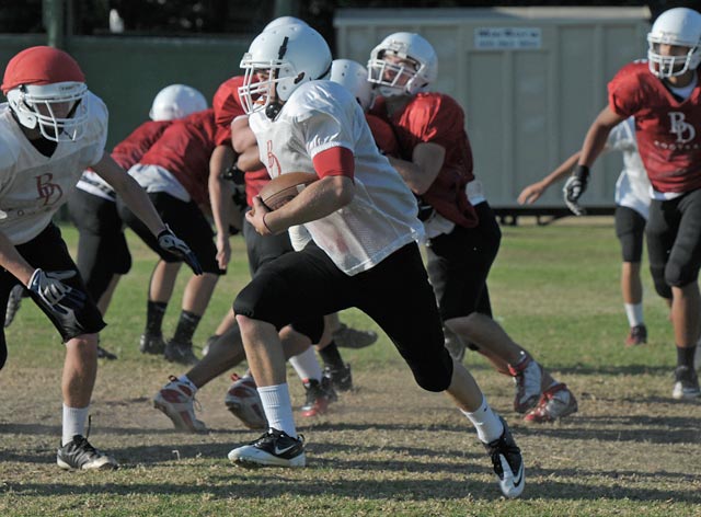 “I’m freezing,” said Kwock, a Bishop running back. He is 5’6” tall and weighs 145 pounds soaking wet — which he was Friday night — and he skittered around the field like a water bug. Carpinteria’s defense did a good job containing his end runs and full-speed kickoff returns, but by spreading the Warriors out, Kwock helped pave the way for the power running of 190-pound Brandon Gonzalez.