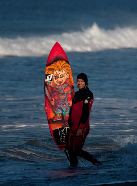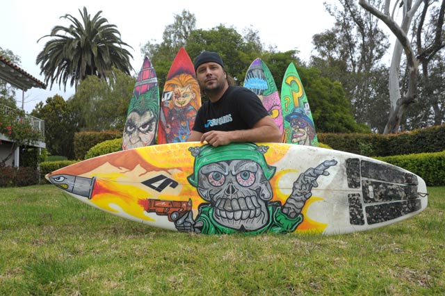 If you have chased quality waves around the 805 with even a modest amount of seriousness during the past 20 years, then you have certainly encountered Aaron Ernst. His act in the water is unmistakable — his boards outrageous canvases of colorful and cartoonish artwork; his demeanor quiet, confident, and, to those who don’t know him, intimidating; his approach to wave riding simultaneously violent and fluid and always fast; his frontside tube riding on par with the best; and his wave count — well, lets just say, it doesn’t matter how many people are in the lineup; the man they call Arson gets his fair share. And then some. He is a surfer’s surfer who, whether you love him or hate him, is a critical part of the South Coast’s surfing landscape. Even better, contrary to the rumors, he is actually a pretty nice dude who also happens to be one heck of an artist.