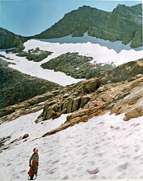 We camped for the night by the stream, where we met a young Swede who promptly managed to set his lantern on fire. Luckily, no wildfire resulted. Leaving our Swedish pal and his lantern behind, we hiked past the base camp the next day and found the glacier climbing difficult. It was studded with so-called sun cups, meaning that instead of normal walking, we had to stride from one indentation to another, quite a tiring, laborious process. The crampons were useless. Curiously, the snow was flecked with crimson algae.