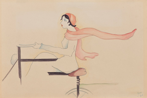 When sketching, Wood relies heavily on gestures, the most apparent being the use of negative space in portraits — using one line to define both the nose and the space where the eye should be, for example, and the dislocation of limbs from their proper connections. The latter move reaches its logical endpoint in “Dance Craze,” a drawing from 1982 that shows disembodied legs entwined in various poses designed to exploit the suggestive potential of isolated limbs. At their most successful, Wood’s drawings pair the simple ironies of the cartoon form with the disruptive tendencies of her contemporaries in the fields of Dada and surrealism. “Holiday,” from 1933, is a composition in watercolor and pencil showing a rather manic-looking Wood at the wheel of a car with her husband in the passenger seat. The bizarre placement of an electric power line across the middle of the car’s windshield lends a certain frisson of shock — one of Wood’s favorite terms — to an otherwise familiar situation. The ultimate sensation to be derived from this exhibition is similar to the one suggested by this piece — a fast and wild ride with a spark plug doing the driving.