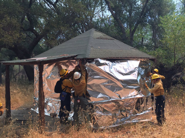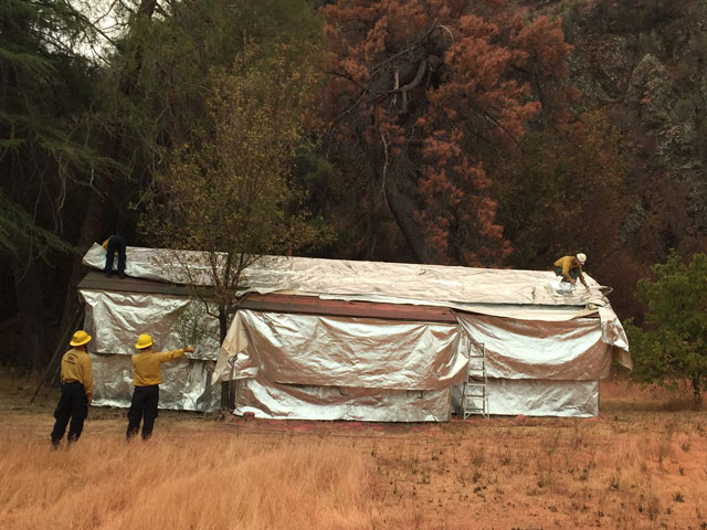 Santa Barbara County firefighters wrap structures at Ogilvy Ranch on August 23 in an attempt to save them from Rey Fire.