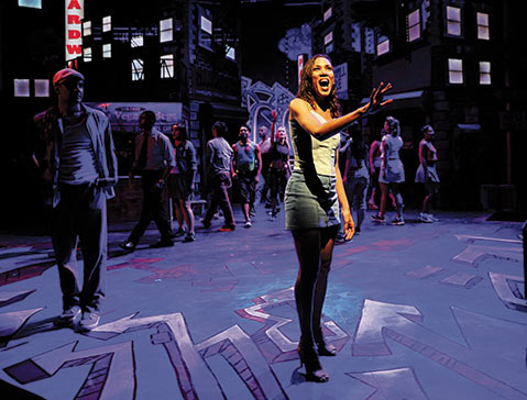 In this story more about the location than the characters who inhabit it, members of In the Heights’s diverse community search for the true meaning of “home” and “identity.” Usnavi (George Walker) runs a small market with his cousin Sonny (Matt Cárdenas) and imagines what life would be like if he had the money to return to his parents’ homeland, the Dominican Republic, or the “skills” to ask out pretty hairdresser Vanessa (Anna Bowen). Nina (Gabriella Pérez) returns home from her first year at Stanford University after having lost her scholarship and has to break the news to her proud parents. Abuela Claudia (Debra Cardona), the neighborhood matriarch, watches over her adopted family from the stoop.