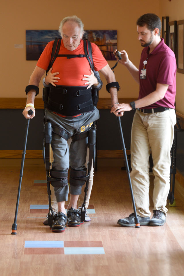 It works by strapping a patient into the suit, which uses battery-powered motors to drive the hip and knee joints. The key is that the patient drives the device, so the robot adapts to the patient’s progress, adjusting the amount of power to either side of the body. “The patient is really controlling the robot,” said Gaines. “The patient is telling it when to step, and the robot is sensing how much help the patient needs and is providing just enough assistance.”