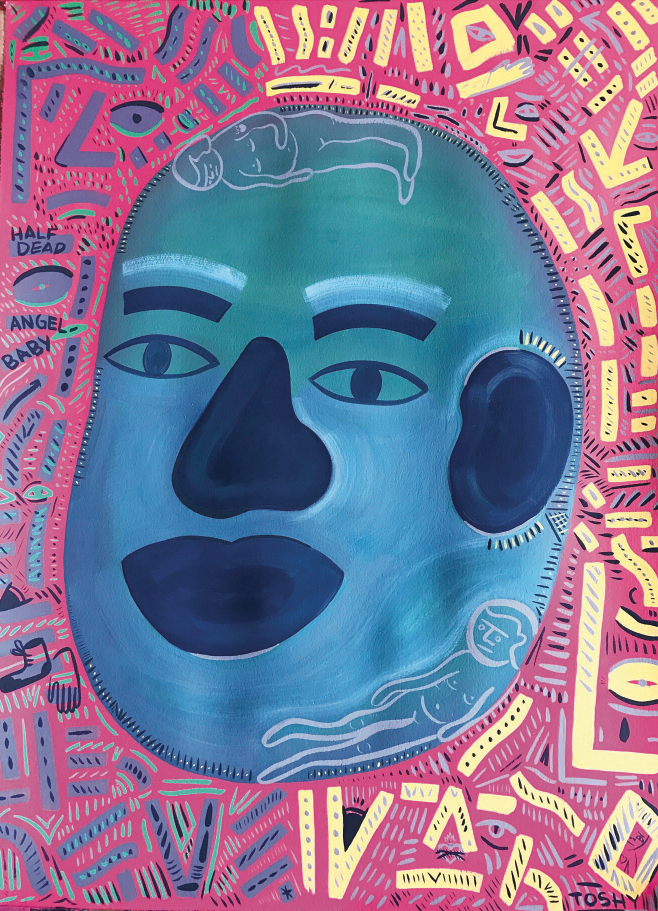 Another painting, “Bored Teenagers,” whose title echoes the Nirvana song “Smells like Teen Spirit,” centers around a frontal blue-black head floating in an orange-red background. Looking simultaneously like a Buddha, an Easter Island totem, and a skinhead, the image summons a universal sense of culture. The words “angel baby,” “half dead,” and “not again” are painted among the ripples of slashes and dots. It stands as one of the most accomplished of the large works.