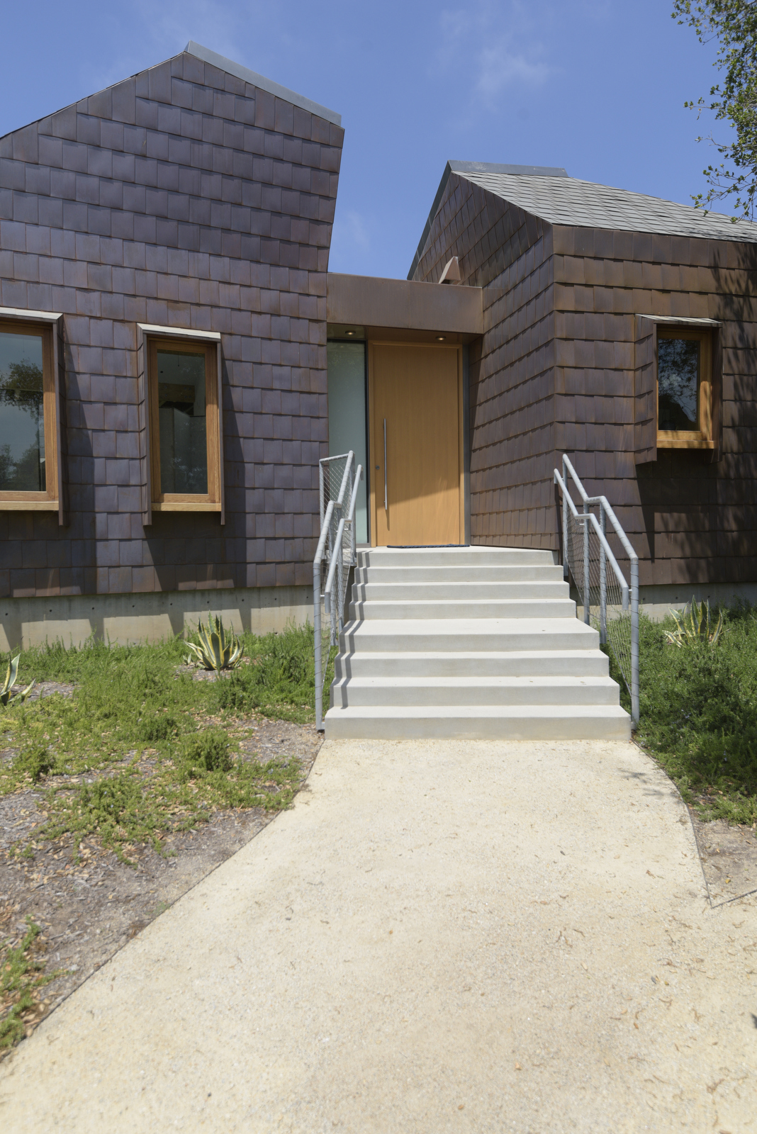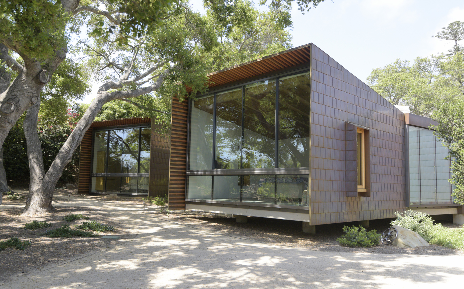 The couple knew they wanted a modern house — “a house of today,” as Cathie Partridge refers to it — and their first request was for a tree house. “I wanted a wooden house, but I knew that because of the fires that was not practical,” said Cathie. Tolkin suggested a sheathing of copper tiles as a fire-resistant alternative, noting that “there’s a tradition of using copper as flashing and for roofs that’s very old and quite common in Europe.” Plus, the copper tiles, properly designed and maintained, would take on a natural patina that complemented the silver and green palette of the trees.