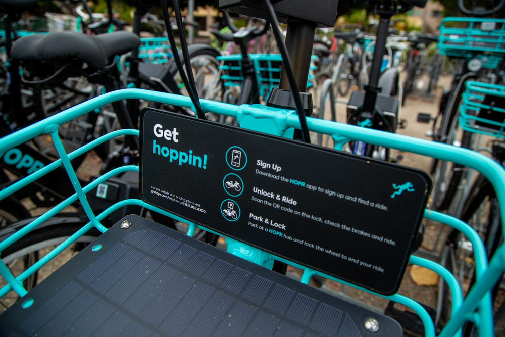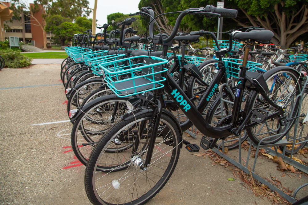 UCSB signed a three-year contract with CycleHop, which rolled 300 of its black-and-teal Hopr pedal bikes onto campus and into Isla Vista on August 31. Theoretically, the bikes are “dockless,” or are rentable via smartphone and then can be left anywhere. But Hopr marketing director Chelsea Davidoff explained that riders are told to return their ride to so-called “parking ponds” scattered around campus and Isla Vista. Bike renters are rewarded for returning bikes to ponds and penalized when they don’t. The county has permitted about a dozen bicycle-parking stations in Isla Vista, taking the view that cheap bike transportation is “one less car in an extremely congested area,” said Matt Dobberteen, the county’s alt-tranportation chief.