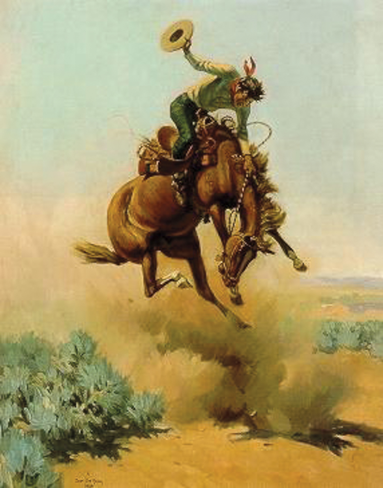 Joe De Yong (1894-1975) was an artist, illustrator, and writer whose works captured life in the Wild West before and after the turn of the 20th century. De Yong’s quest to promote the “cowboy ways” ultimately led to a meeting with the reigning Western artist of the time, Charles M. Russell. De Yong worked with Russell until the latter’s death in 1926, after which De Yong moved to Wolf, Wyoming, to work at Eaton Ranch, one of the first “dude” ranches. Later, De Yong moved to Santa Barbara to work with the now-legendary Edward Borein and Maynard Dixon, among others. By the end of his life, De Yong had become a well-known and influential artist.