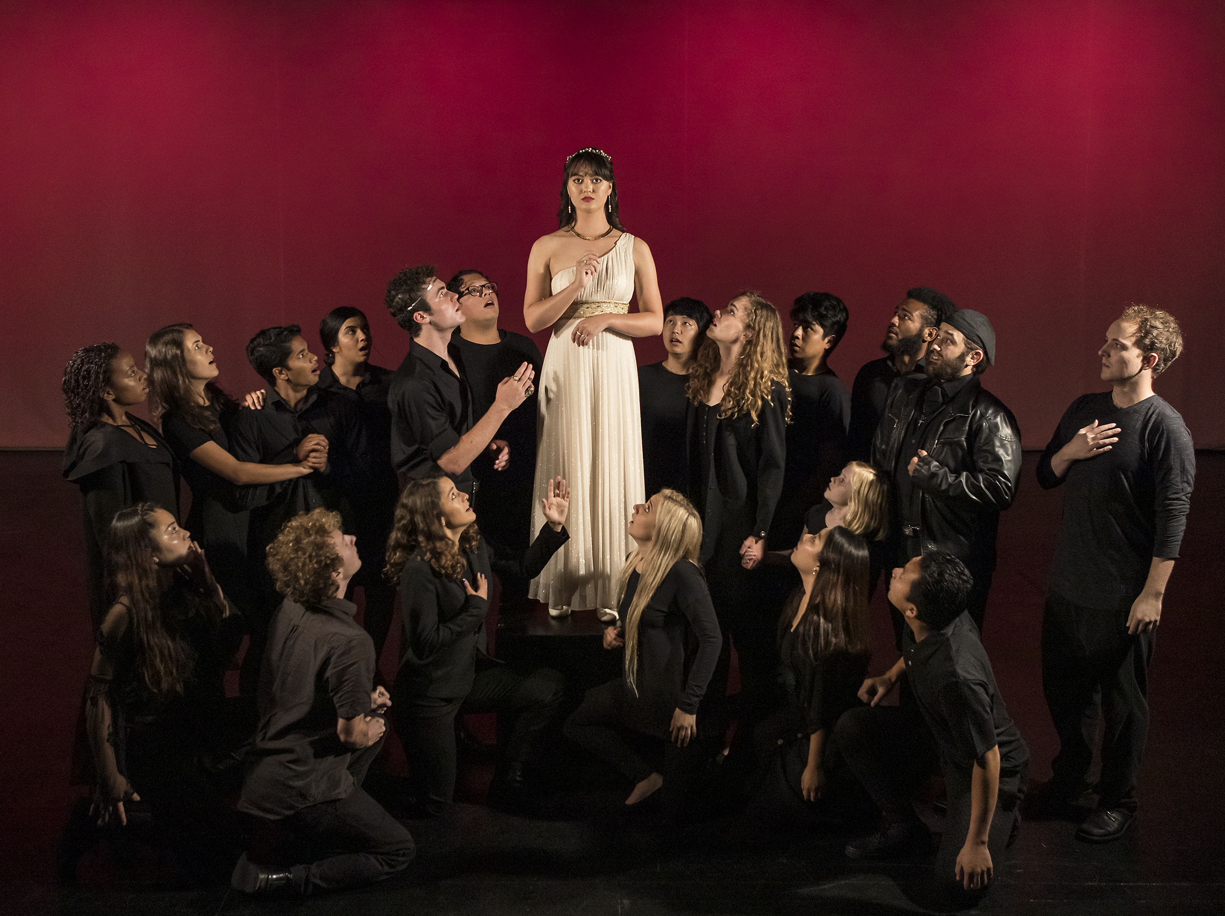 Using the breadth and depth of the Hatlen Theater stage to maximum effect, the players delivered a clear and swinging account of the script’s complex doublings. Affairs in Sicilia run tragic and require powerful bursts of rhetoric not only from the accused queen Hermione (Kat Cleave), but also from Antigonus (Cyrus Roberts) and Camillo (Chris Nasser), both of whom attempt to dissuade Leontes from his reckless course. Bohemia, by contrast, presents characters both witty, like the rogue Autolycus (Harry Davis) and love struck, like the wonderful Perdita (Betty Galindo) and her suitor Florizel (Vishay Singh). The finale was particularly moving as these disparate kingdoms came together for a series of amazing revelations.