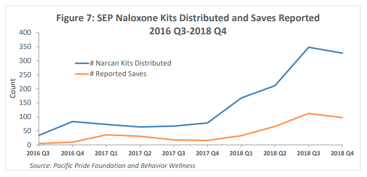 “We have been working to address the national opioid overdose crisis locally with our syringe-exchange clients for the last few years, training them on Narcan,” said Colette Schabram, executive director of Pacific Pride, referring to naloxone’s product name. “We also go out into the community to train medical teams, law enforcement, and outreach providers on how to administer the overdose medication. This has resulted in our program seeing specialized and impactful results in the community,” she added, as reflected in the striking statistics in a report submitted to the County Board of Supervisors on December 10.