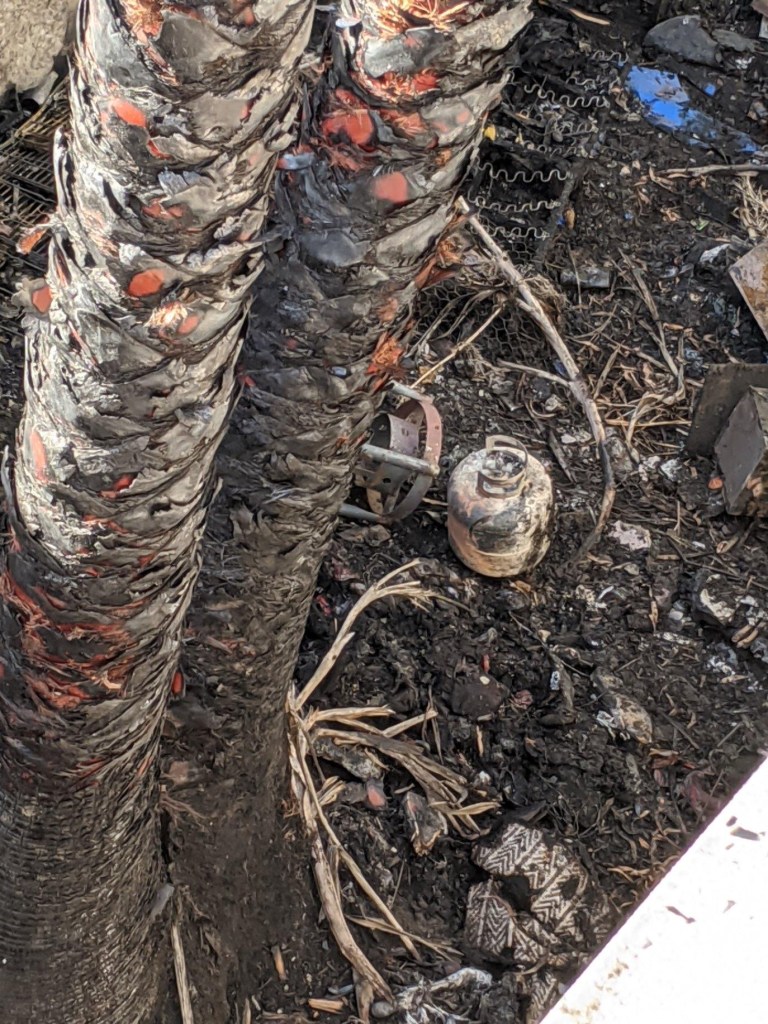 “There are so many types of ignition sources,” Mercado said, but on first glance, the fire seems to have started on the ground and spread to the trees. He explained the small popping sounds or explosions could have come from aerosol cans or small cans of propane used in cook stoves. The firefighters were intent on keeping the fire from the warehouse, he said. The wall between the open area and the business was cinder block covered in stucco, Mercado said, both good, fire-resistant materials that helped keep the fire from spreading.