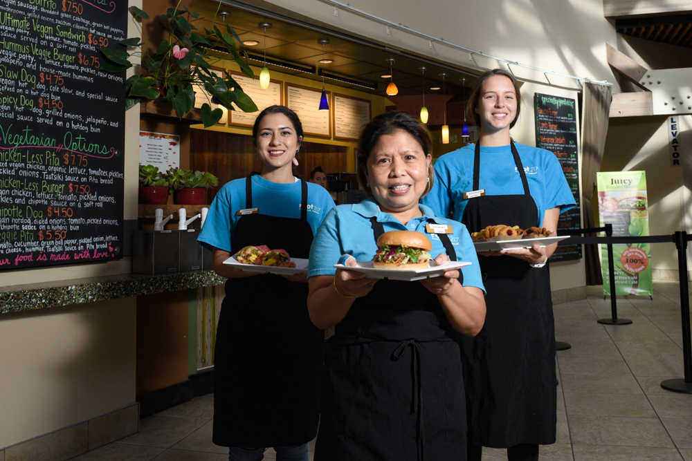 Root 217 Employees (from left) Janee, Liza, and Kelsey provide healthy options for UCSB students. | Credit: Paul Wellman