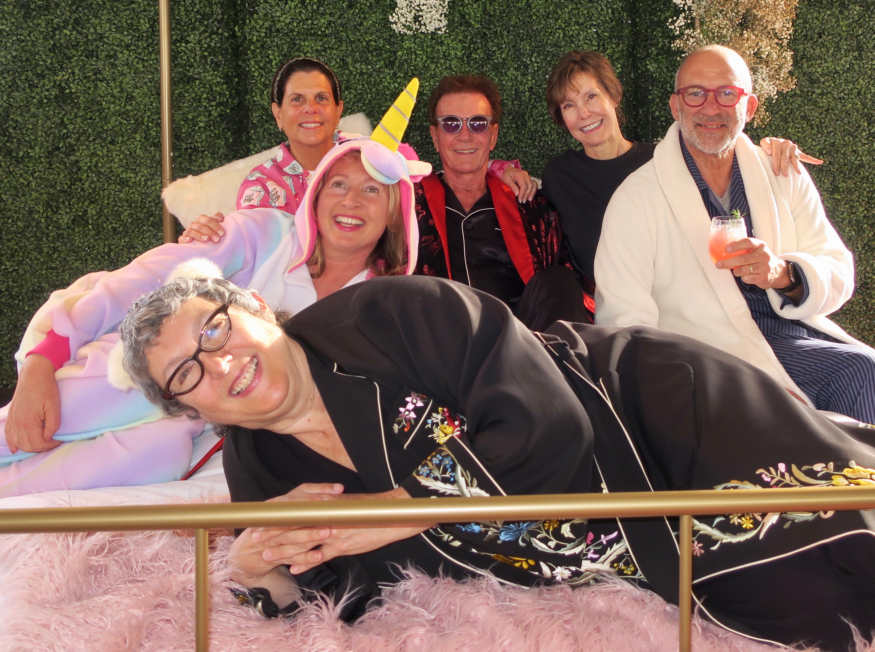 The 160 guests strutted down the carpet in an assortment of bedtime attire, including Kathy Ireland sporting a soft pink robe. Guests entered a fabulous clear-walled tent with a vaulted ceiling, where they mingled and feasted on gourmet food and beverage offerings from multiple purveyors. Some watched the other pre-Oscar party on a jumbotron, others had fun posing for photos on a king size bed. Everyone seemed to enjoy the theme, happily leaving the gowns and tuxes at home. Afterwards, guests got to watch the Oscars in the Riviera’s state-of-the-art theater.