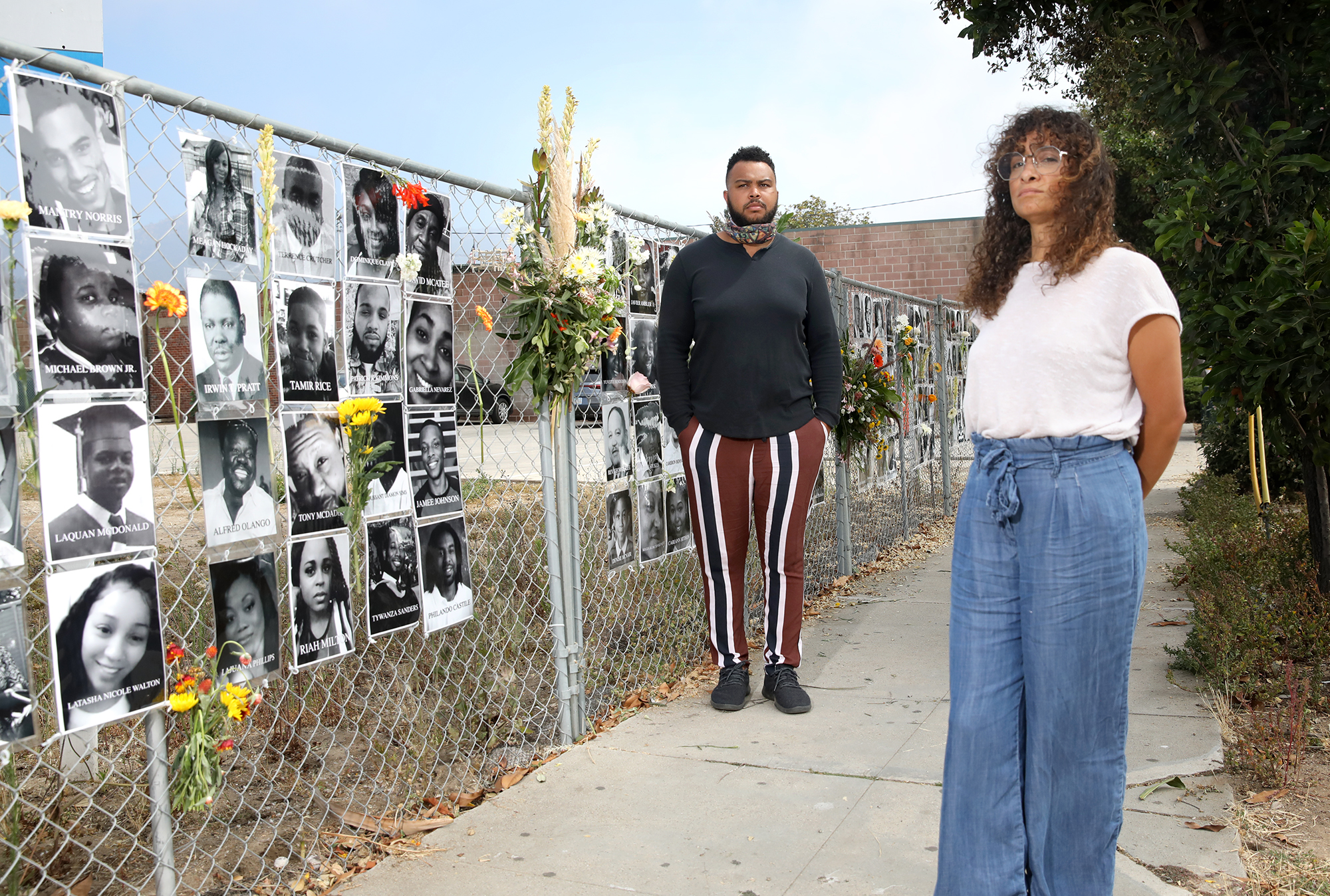 A photo of each person along with floral arrangements were weaved into a chain-link fence on a vacant lot. Many of the faces are of those more recently deceased, including Santa Barbara High graduate Meagan Hockaday, who was killed in 2015, but there were also faces of those killed decades ago, such as Emmett Till. Resch said she expects they will add more photos in the coming weeks.