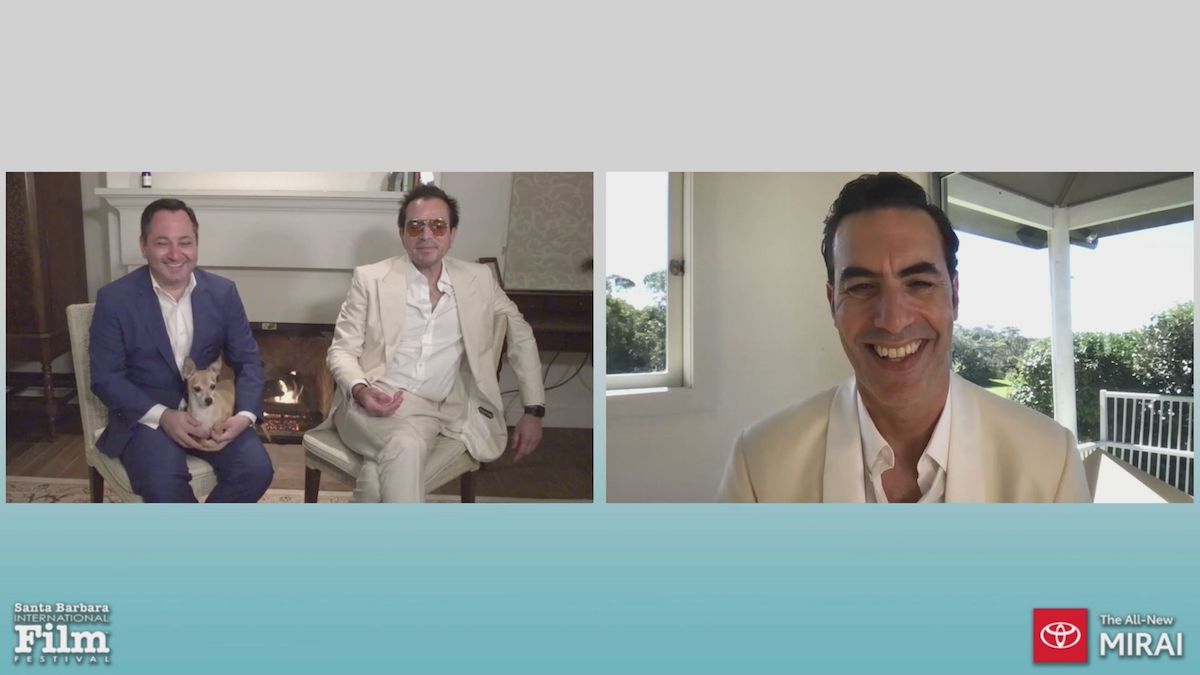 Setting an aptly loopy atmosphere for the event, it opened with a two-shot of both event host Scott Feinberg and SBIFF domo Roger Durling, perched before a fireplace in a suite at the swanky El Encanto hotel, alongside a compact canine as prop and petting object. Durling was dressed in a cream-colored suit resembling the attire of Cohen himself, appearing in a room with a backyard/orchard in the background (whereabouts undisclosed: as one of cinema’s most daring provocateurs, Cohen/Borat benefits from clandestine conditions).