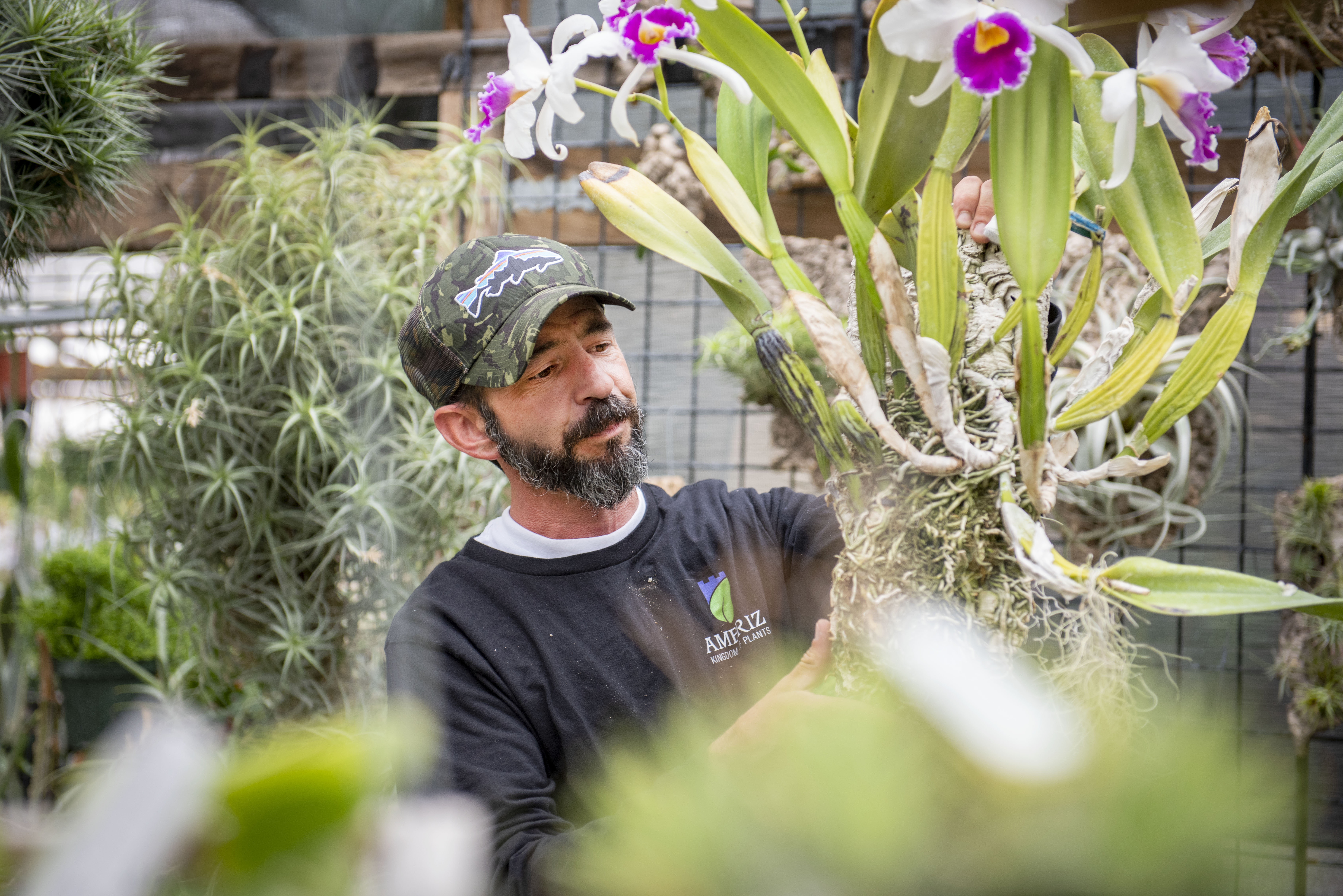 Ambriz got his start with orchids — a friend gifted him with a cymbidium, and when it died a year later, he was determined to learn how to keep it alive. That sent him into a deep dive into the world of horticulture: first as a hobbyist — at the time he was working as the percussion director for Santa Barbara High, his alma mater — and then working for 7 Day Nursery, with a small area for cultivation at Island View Nursery. When that property sold, his current spot became available, and he leaped at the opportunity for a kingdom of his own about five years ago.