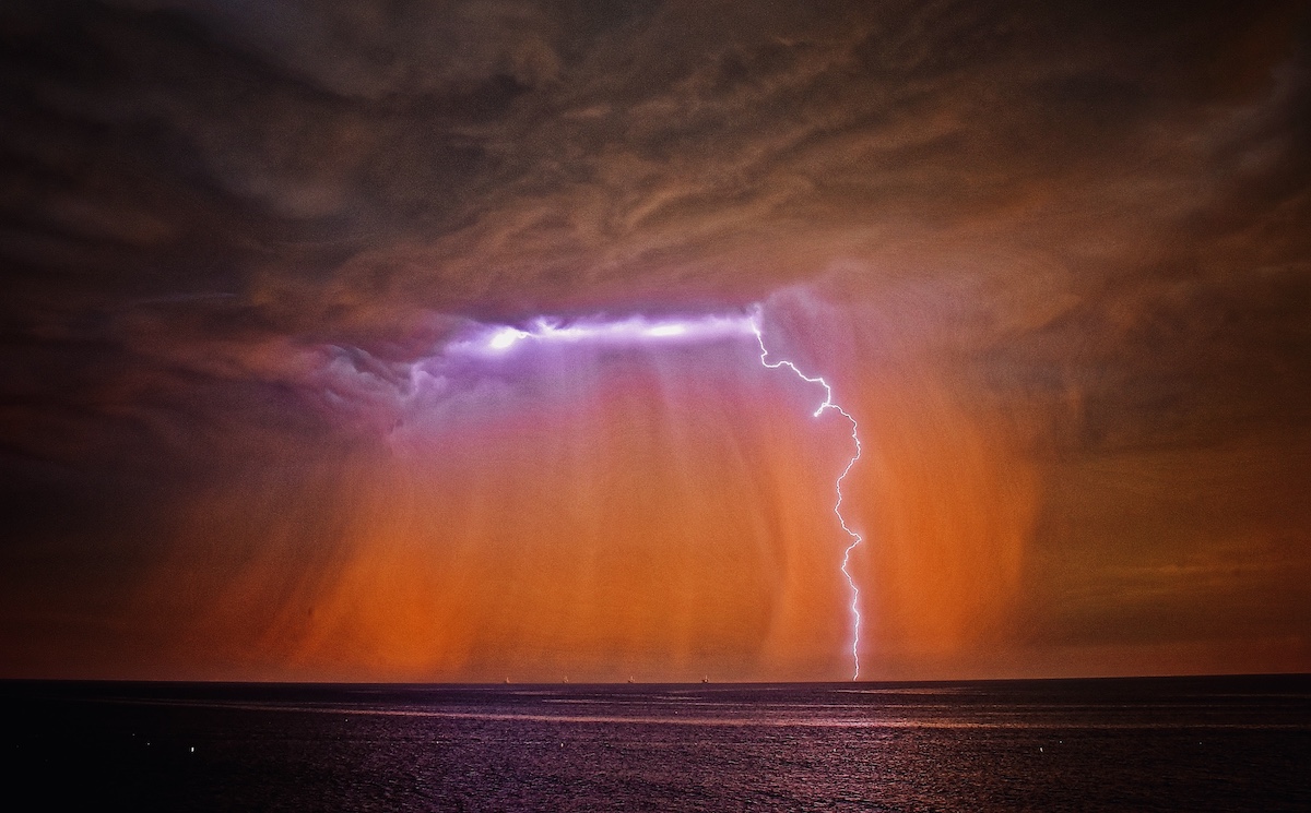 The rare appearance of rain, along with the spectacular show of lightning and roaring thunder, sent many residents looking to the sky to watch the storms. Photos of rainbows, heavy clouds, and curtains of rain backdropped by choppy seas and braids of purple, orange, and yellow in the sky flooded social media Monday night as people braved the wet weather to snap a rare sunset lightning storm photo.