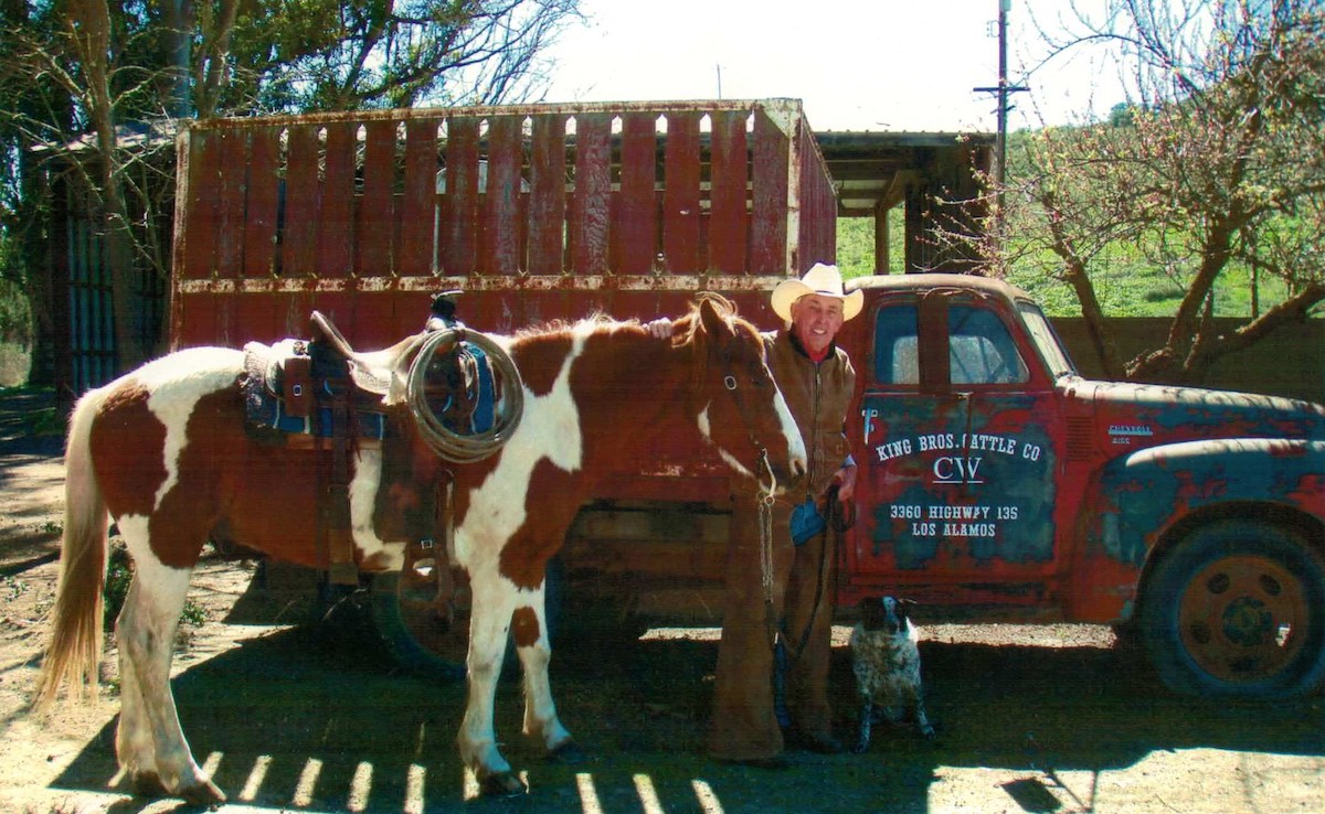A large stock of rural ranching folks mingled with early California families before streaming into Mission Santa Inés in late February for the celebration of Los Alamos cattleman Bill King’s funeral mass. The priest met “Cowboy Bill’s” coffin in the vestibule. The pallbearers were Bill’s working cowboy crew — wearing blue jeans, boots, and the new black cowboy hats they’d each bought for the privilege of escorting Bill on his last trip up the aisle of the old mission. As they walked, Bill’s own robust baritone, recorded in slow triple meter, welcomed his family and friends “ … like a storybook ending … my heartbreaks and troubles are just up and gone … I could waltz across Texas with you” — Bill’s signature song.