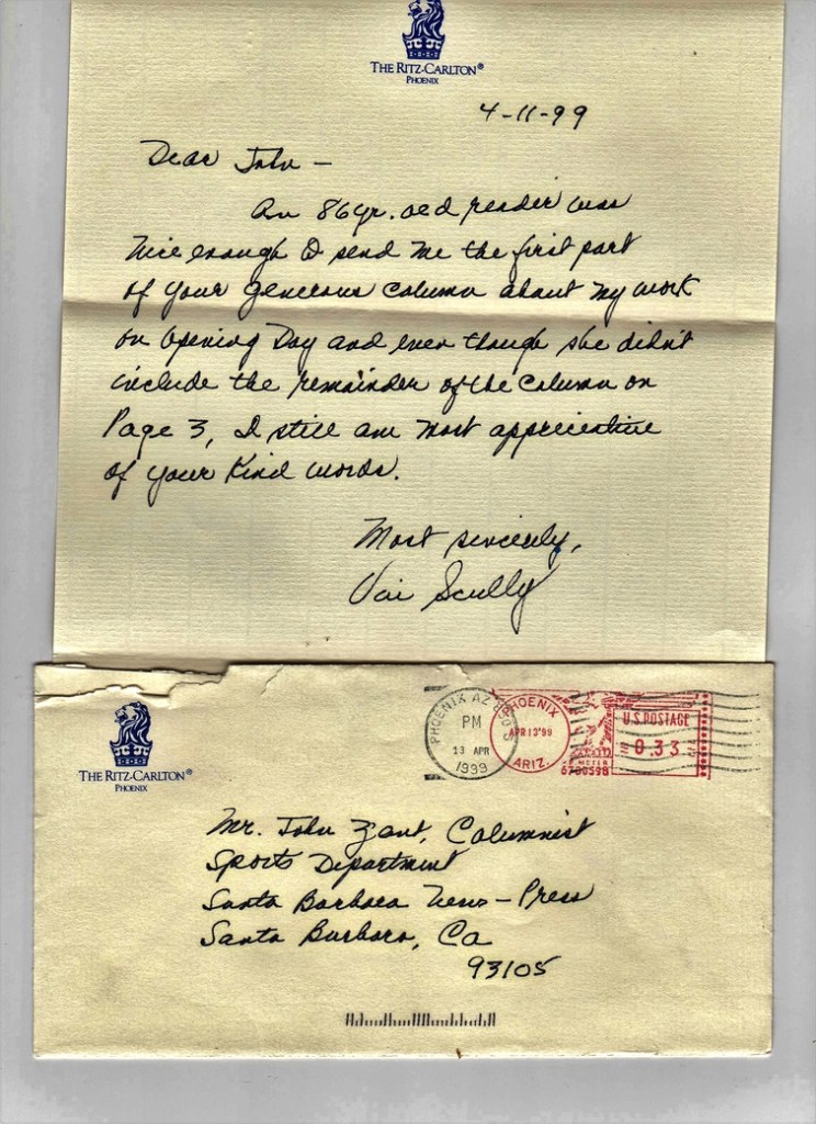 A week later, an envelope postmarked from Arizona, where the Dodgers were playing the Diamondbacks in another series, arrived on my desk. Inside was a handwritten letter from Vin Scully. A reader had sent him a partial copy of my column, and he wrote to me that he was “most appreciative of your kind words.” I immediately sent him the missing “jump” of the column, and he replied with another note of gratitude.