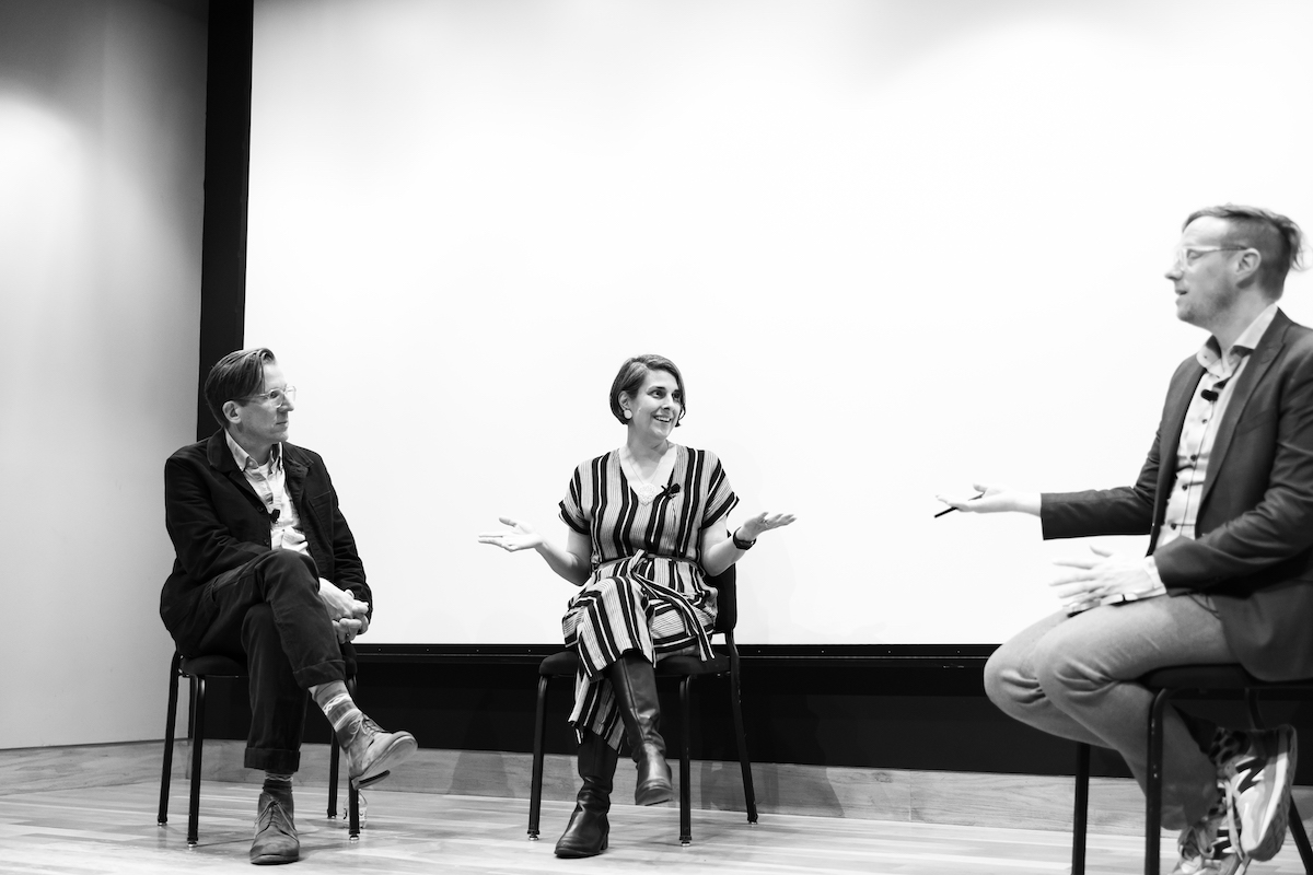 Jones, a remix visual artist who uses digital images to create often humorously reflective large-scale pieces, and Jorgensen, the Grammy Award–winning keyboardist for the alt-rock band Wilco, spent the first chunk of the night reflecting on their separate artistic practices.