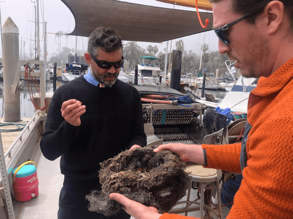 Das Williams and Ian Jacobson (COO of Holdfast) looking at the California mussel “seed” that was out-planted on April 10 | Credit: Courtesy