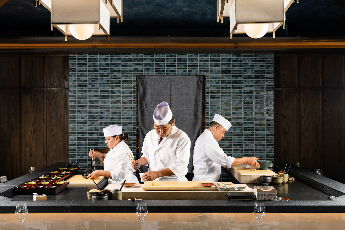 “AMA is a small Tokyo home where guests are invited to experience the intimacy and tradition of an ancient Edomae-style sushi. They can choose a prix-fixe dinner in the dining room or the more personal experience in the omakase bar,” said Massimo Falsini, director of culinary operations for the resort. “In many ways, our omakase is a spiritual companion and counterpoint to kaiseki, an elaborate multi-course meal built around seasonality, quality ingredients, and simple preparation.”