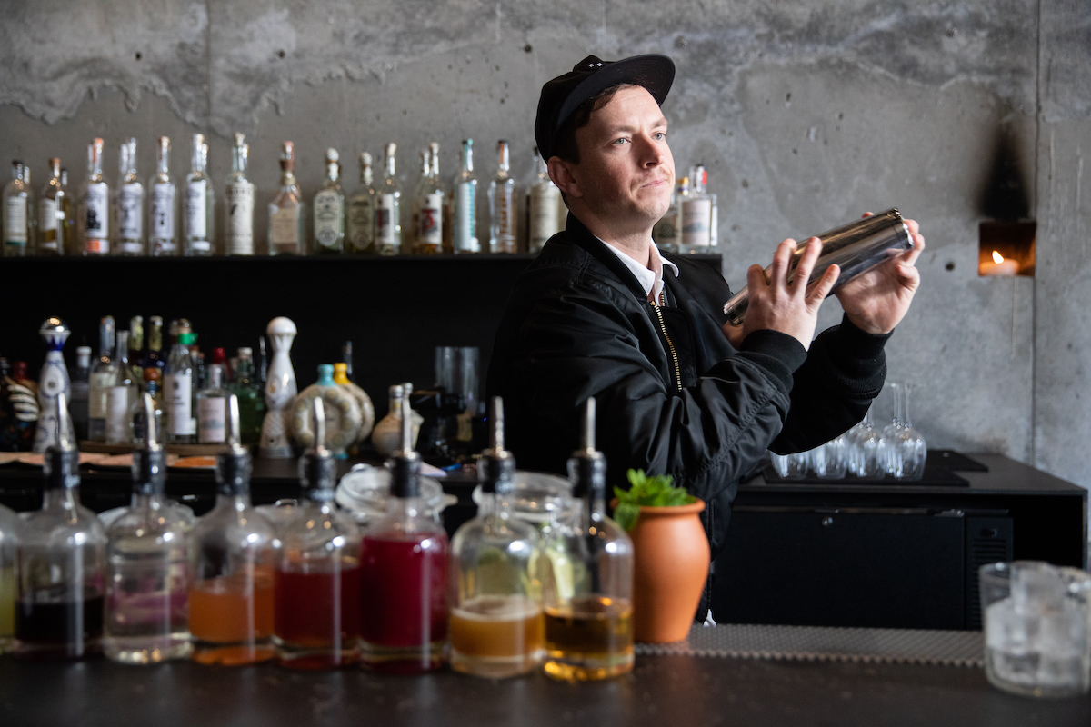 Tending to Dusk is John Hardin, who’s developed an extensive array of fresh juices, tinctures, syrups, seasoned salts, and cocktailing gadgets to accompany the deep list of mezcals, tequilas, and other agave-based spirits on the bar’s back wall. The search for new liquors and mixers never stops for this former food and beverage director at the Ace Hotel & Swim Club in Palm Springs, who explained, “We’re constantly looking for new brands and really cool stuff.”