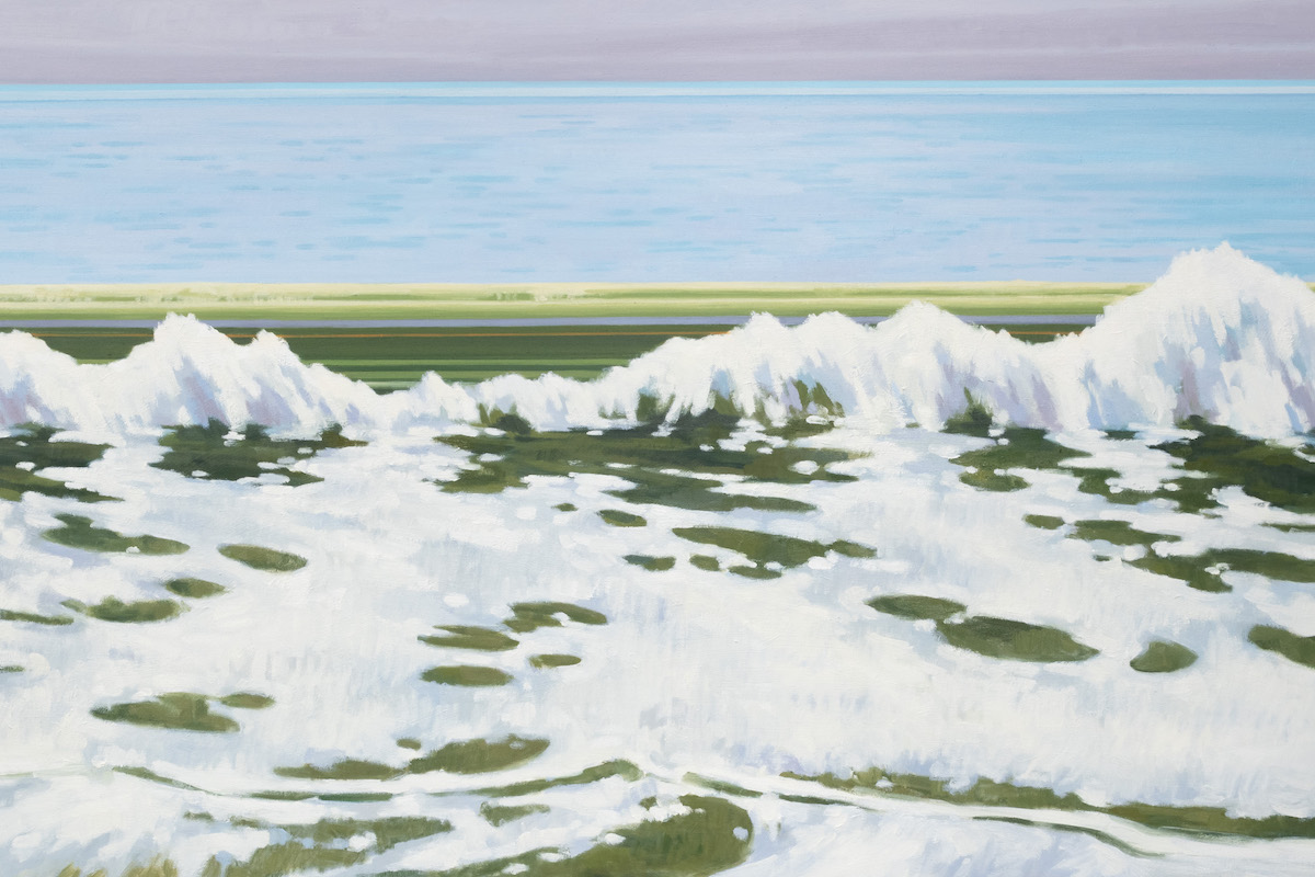 Walk into the gallery proper to find the fuller range of ideas and variations on her sea theme — and “change” theme — via a series of paintings that are diverse in scale and intention. Following up on past strategies, Strasburg includes square-formatted multiples, with 14-inch square paintings nestled into a larger suite of 16 images, following a relatively “straight” approach to seascape representations, with subtle twists.