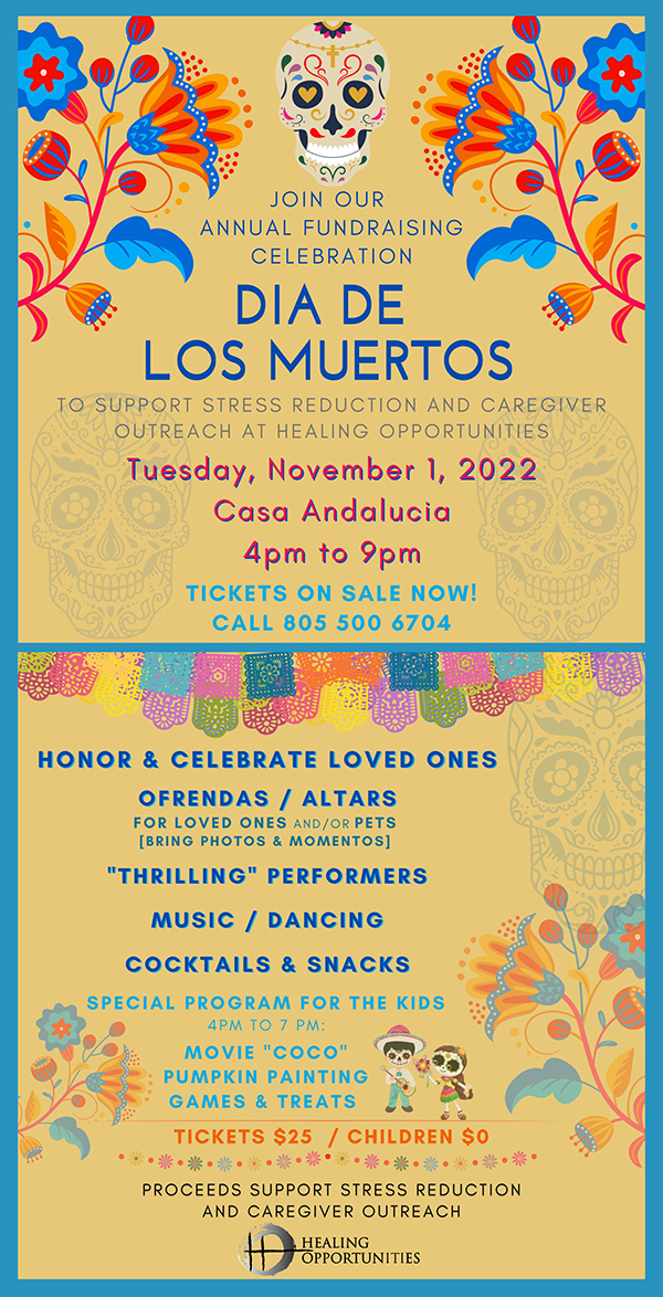 An Early Reception, prior to the celebratory Evening Program welcomes casual mingling and perusal of the ofrendas (altars). Guests are encouraged to bring photos of loved ones, and pets as well. A Kids’ Program offers entertainment, activities, healthy treats and a screening of the movie Coco. This event supports Healing Opportunities’ program to impact community health by reducing the negative effects of stress and trauma, with a focus on our caregiver population.