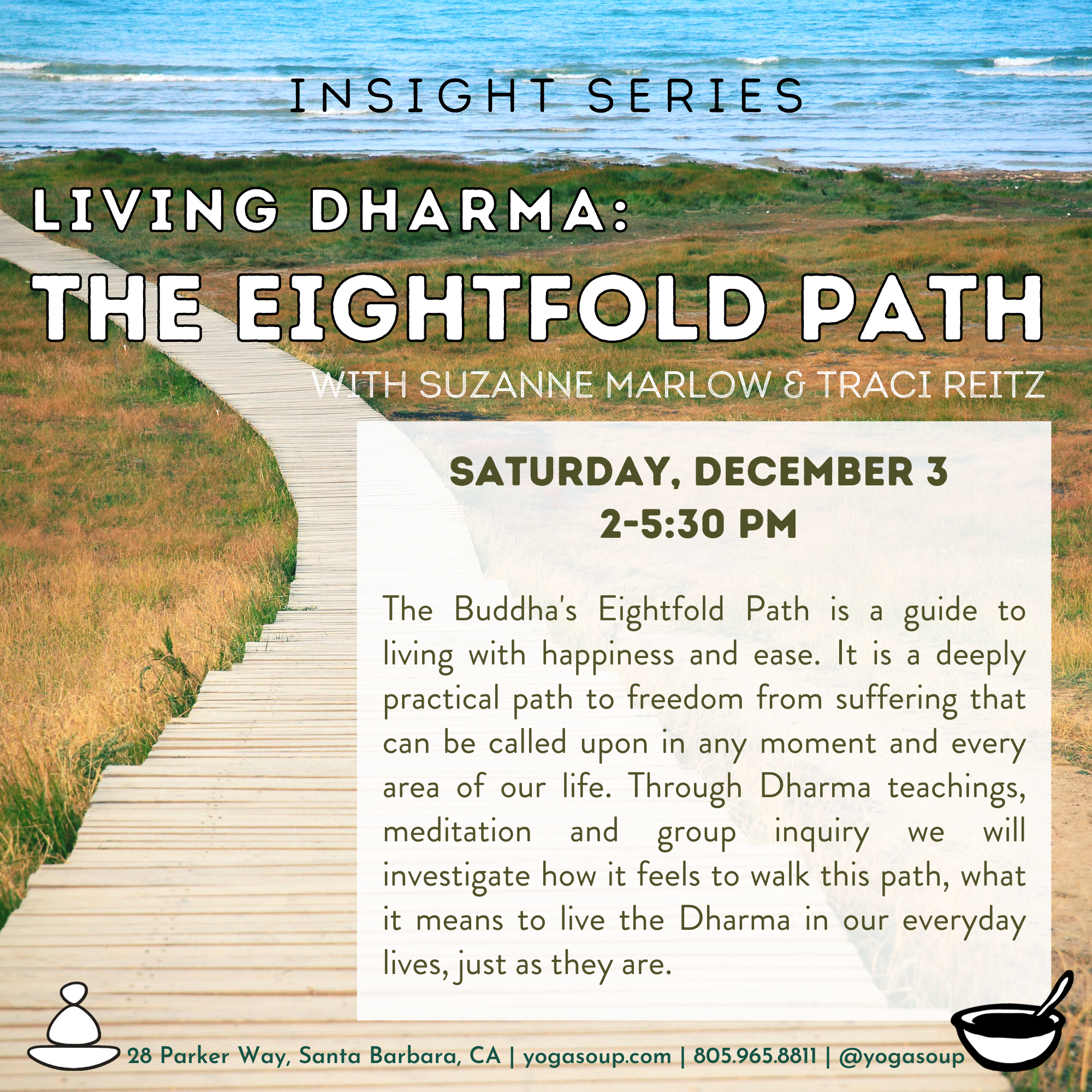 The Buddha’s Eightfold Path is a guide to living with happiness and ease. It is a deeply practical path to freedom from suffering that can be called upon in any moment and every area of our life. Through Dharma teachings, meditation and group inquiry we will investigate how it feels to walk this path and what it means to live the Dharma in our everyday lives, just as they are.