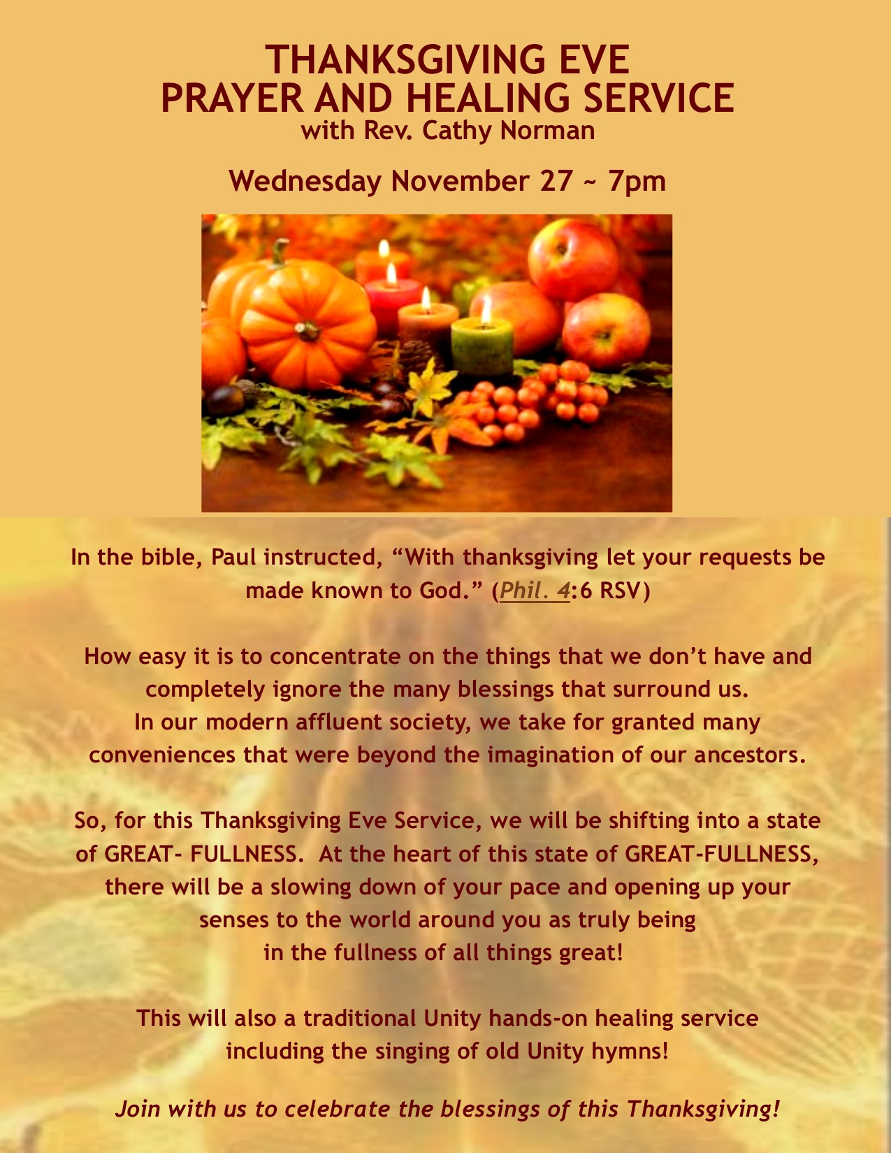Join us for a prayer and healing service with Rev. Cathy Norman. An evening of singing, healing, and prayers of gratitude for ourselves, and one another, and the World. All are welcome.