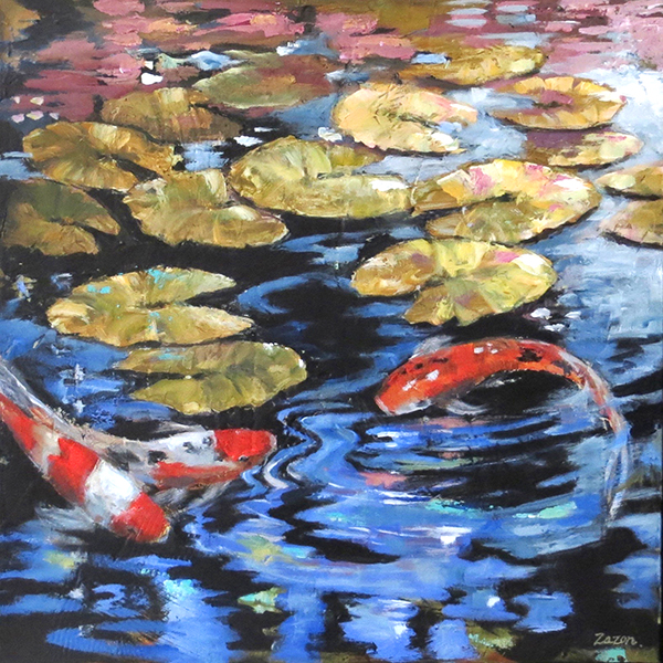 Karen Zazon’s painting “Koi Play” exudes a peaceful meditative state of mind that we all seek. Her abstracts continue that feeling with Asian-inspired line, color and composition.