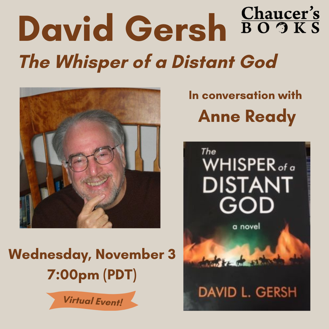 Please join us for a virtual event with local author David Gersh on Wednesday, October 3 at 7 p.m.   He’ll be speaking with Anne Ready about his book THE WHISPER OF A DIFFERENT GOD on Zoom and YouTube Live!