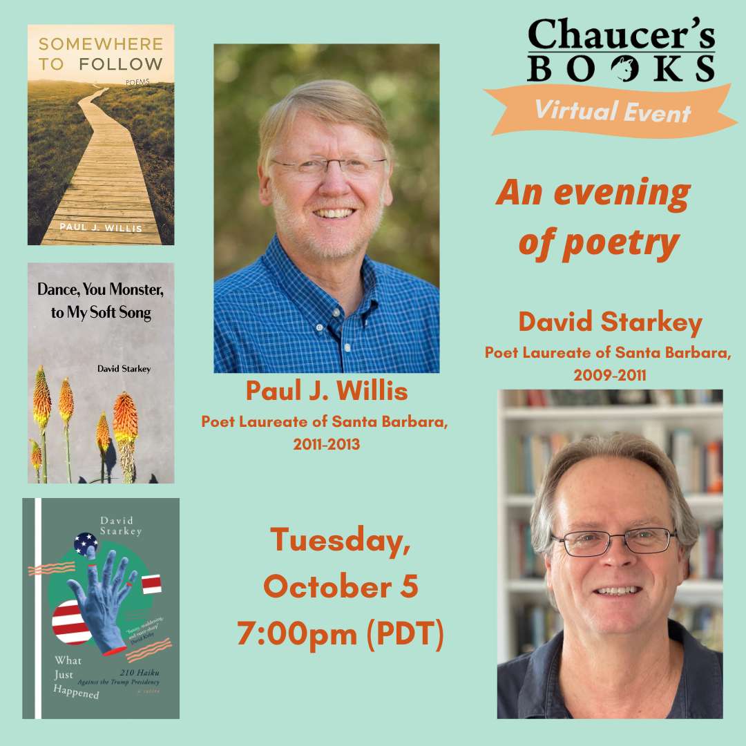 Please join us for an evening of poetry with two former Poet Laureates of Santa Barbara, David Starkey and Paul Willis on Tuesday, October 5 at 7 p.m.