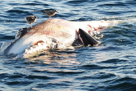 On September 29, passengers aboard an Island Packers tour boat headed back to the Ventura Harbor after a day on Santa Cruz Island were witness to a rare and gruesome sight: three, full-grown great white sharks — accompanied by around 12 blue sharks — feeding on a Minke whale carcass floating in the Santa Barbara Channel. Check out the photo and video above and below. (Photo credit: Josh Mead) (Video credit: Andrea Mills)